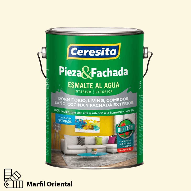 Esmalte al Agua Pieza y Fachada Marfil Oriental en galón (código 11377701) de Ceresita es un esmalte semibrillante desarrollado para uso interior y exterior. Su fórmula Biotech protege contra hongos, algas y bacterias, entregando un acabado lavable, resistente y duradero en muros y fachadas.