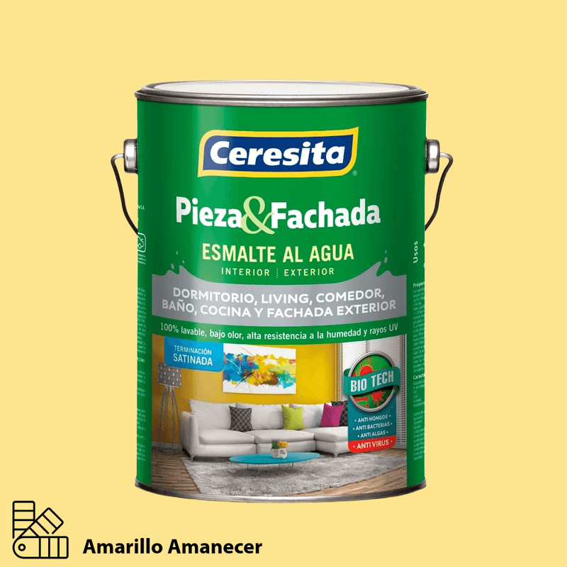 El esmalte al agua Pieza y Fachada BioTech Amarillo Amanecer con código 11483501 de Ceresita es una pintura de alta calidad diseñada para muros interiores y exteriores. Su tecnología BioTech asegura gran resistencia a la intemperie, protección contra hongos y algas, y un acabado decorativo duradero.