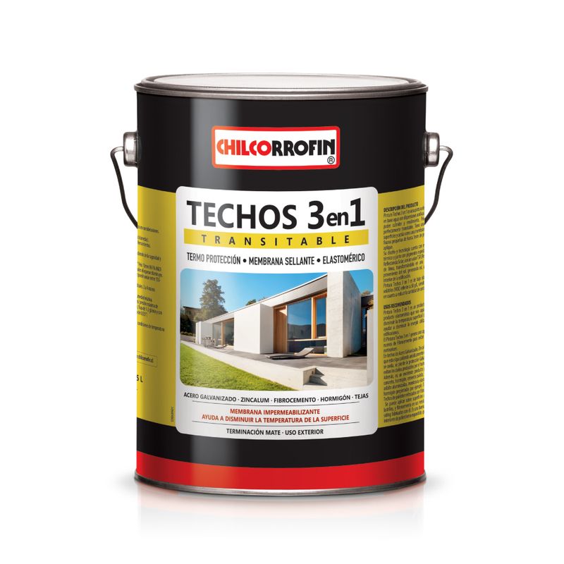 La Pintura Techos 3 en 1 Elastomérico Negro GL (código 31774101) de Chilcorrofín es un recubrimiento elastomérico mate, base agua con dispersiones acrílicas, diseñado para techos y superficies transitables que requieren protección impermeable, elasticidad y durabilidad estética.