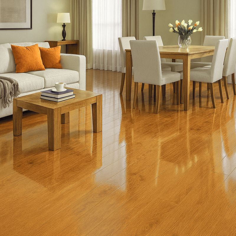 El piso flotante PIANO Brillante Roble de 8,3 mm y cobertura de 1,90 m² por caja presenta un acabado en tono roble con brillo, aportando calidez y elegancia en interiores residenciales.