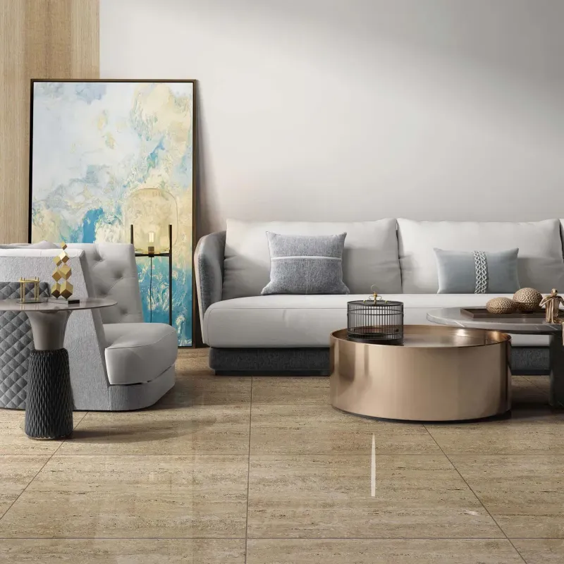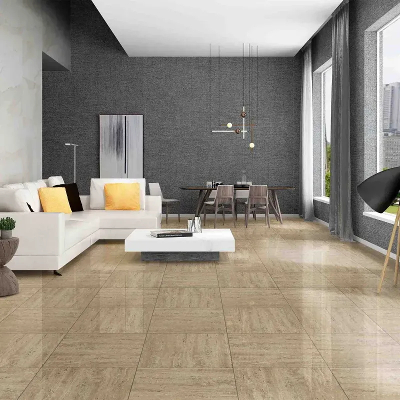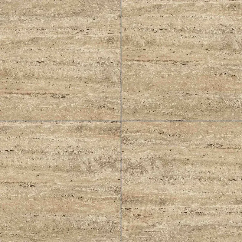 Su diseño tipo travertino y acabado pulido aportan luminosidad y continuidad visual, ideal para ambientes residenciales o comerciales que buscan un acabado sofisticado y fácil de mantener.