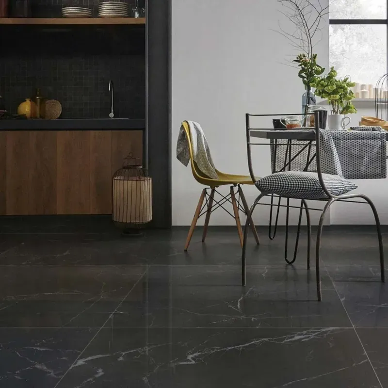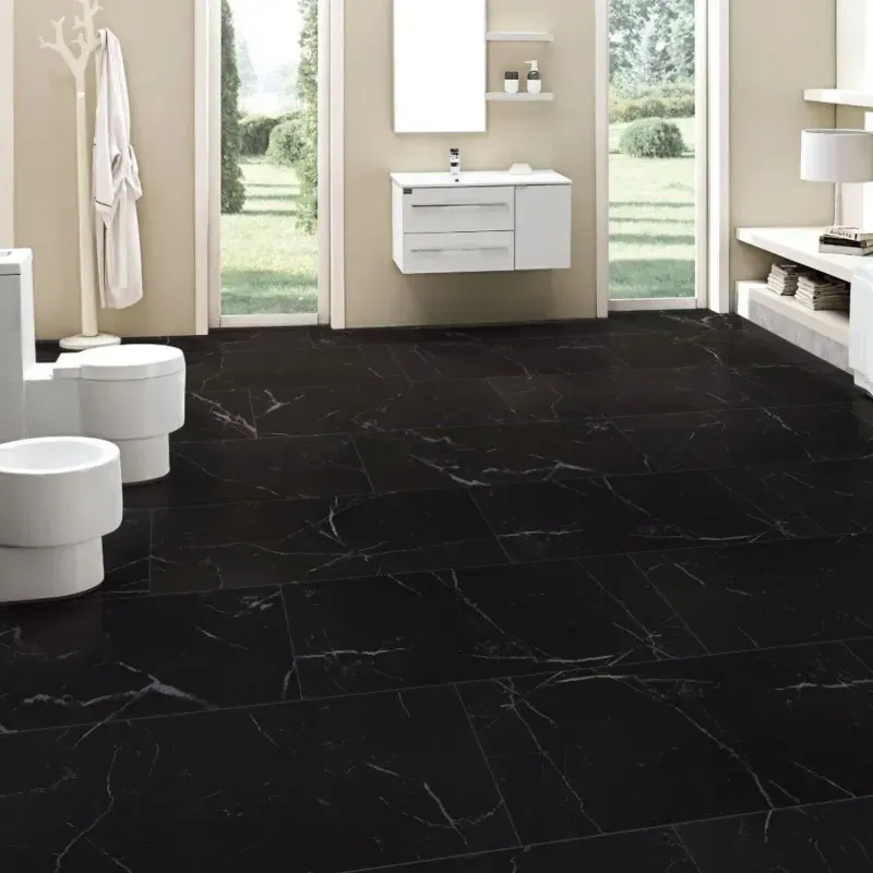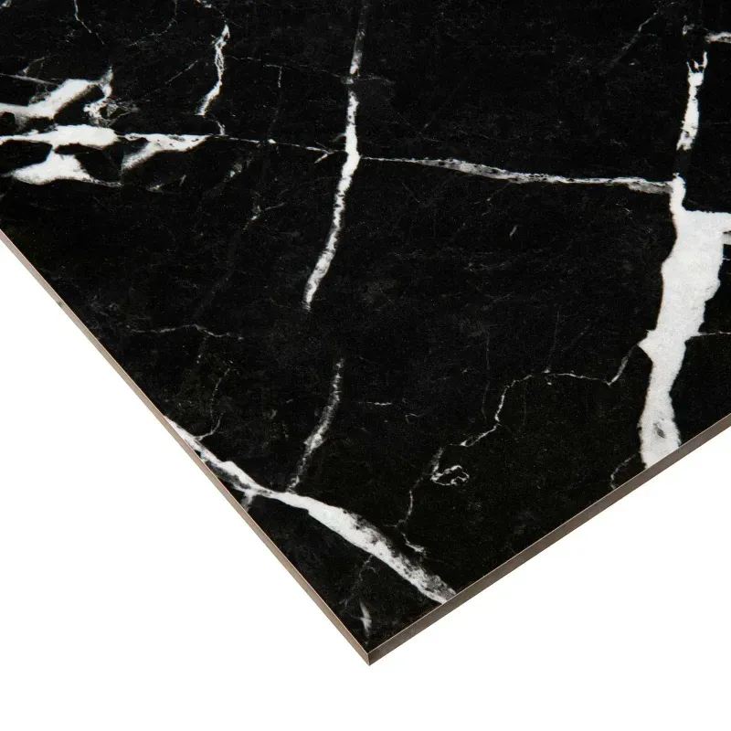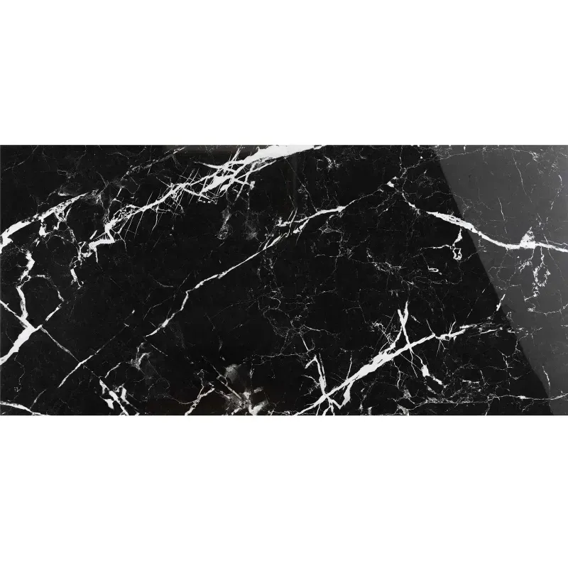 El porcelanato Black Marquina en formato 60×120 cm y acabado pulido ofrece una apariencia tipo mármol negro con vetas blancas, ideal para dar un estilo sofisticado y elegante a pisos y muros interiores.