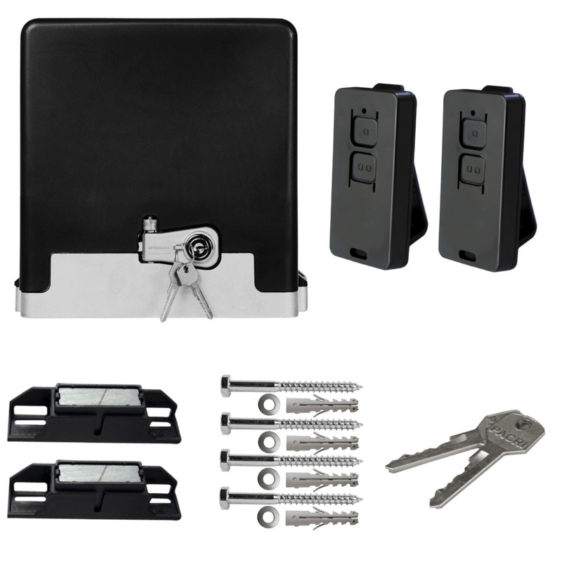 - Incluye: 2 controles remotos, 2 finales de carrera, central de mando, 2 llaves de destrabe