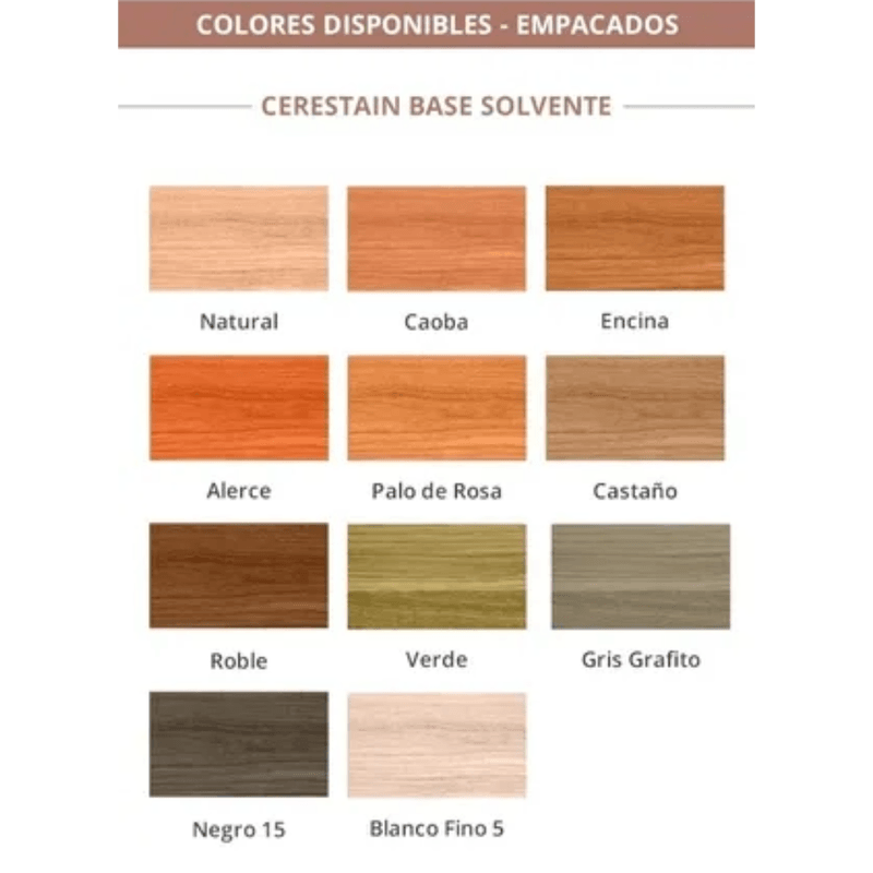 - Propiedades: Alta penetración, resistencia a hongos y radiación solar, realza la veta natural de la madera
