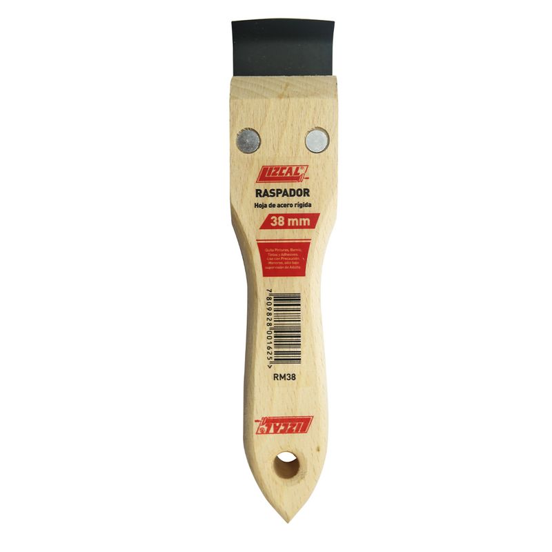 Raspador con hoja de acero Lizcal de 38 mm, diseñado para la remoción de barniz, pinturas, tintes y adhesivos sobre distintas superficies. Cuenta con una hoja de acero rígida que permite un raspado eficiente y un mango de madera que entrega un manejo cómodo y seguro durante el uso.