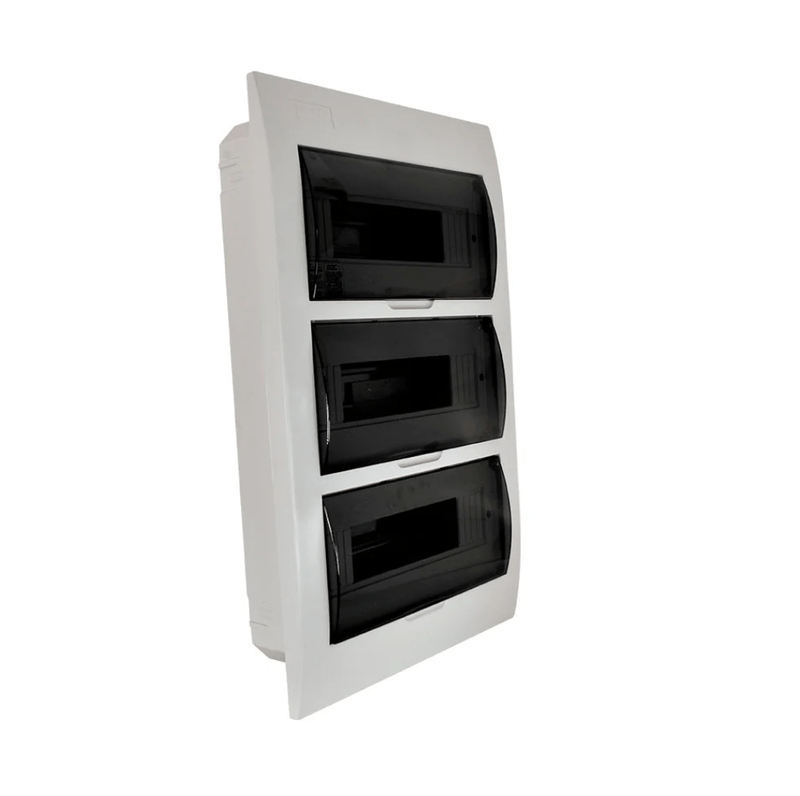 Tablero eléctrico embutido Lexo de 36 módulos, diseñado para instalaciones eléctricas de mayor capacidad. Permite el montaje de protecciones en riel DIN, con estructura libre de halógenos y tapa color humo de apertura vertical.