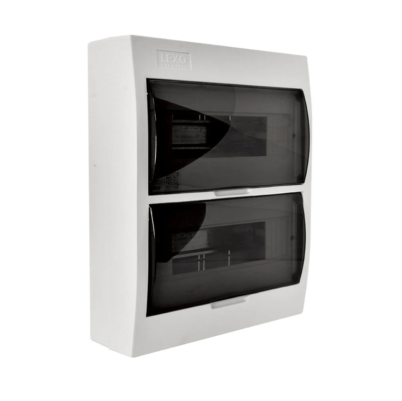 Tablero eléctrico sobrepuesto Lexo de 24 módulos, desarrollado para instalaciones eléctricas de mayor capacidad. Permite el montaje de dispositivos de protección en riel DIN y cuenta con tapa color humo.