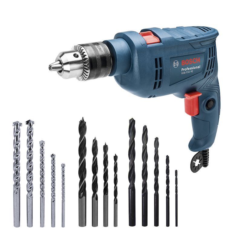 El Taladro Percutor Bosch GSB 550 RE de 550W es una herramienta práctica y confiable para tareas de perforación domésticas y semiprofesionales. Esta versión incluye un set de 14 brocas para concreto, madera y metal, lo que lo convierte en una excelente opción lista para usar.