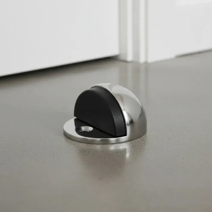 Su diseño compacto tipo media luna permite una fijación firme al piso, ayudando a prevenir daños por golpes y prolongando la vida útil de puertas y muros.